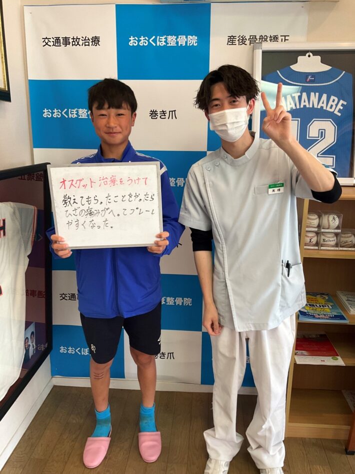 約2ヶ月前から痛みがあって、近所の整形外科を受診してレントゲン検査をしてオスグットと診断されました。オスグットの痛みが取れないため友人の紹介で当院を受診しました。