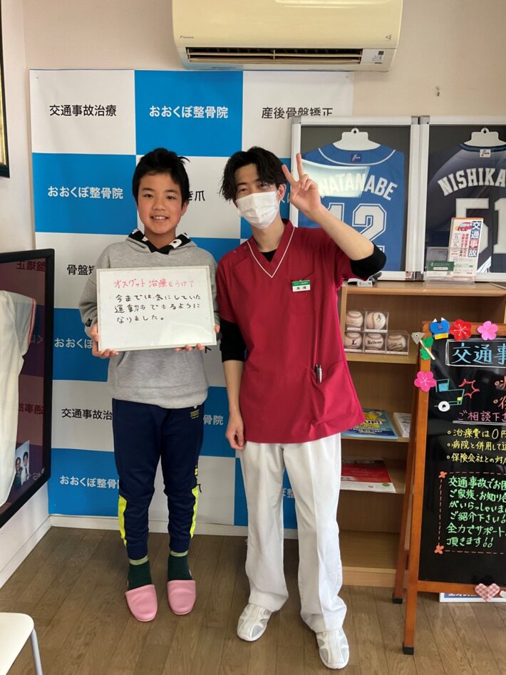痛みなく、野球と体操をできるようになったので、ステップアップして、痛みが出にくくなるような体の使い方を指導して2回でオスグットの治療を終了しました。
